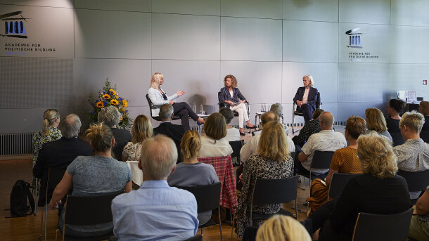 Von links nach rechts: Frau Staatsministerin Ulrike Scharf, Moderatorin Frau Sybille Giel und Frau Prof. Dr. Ursula Münch