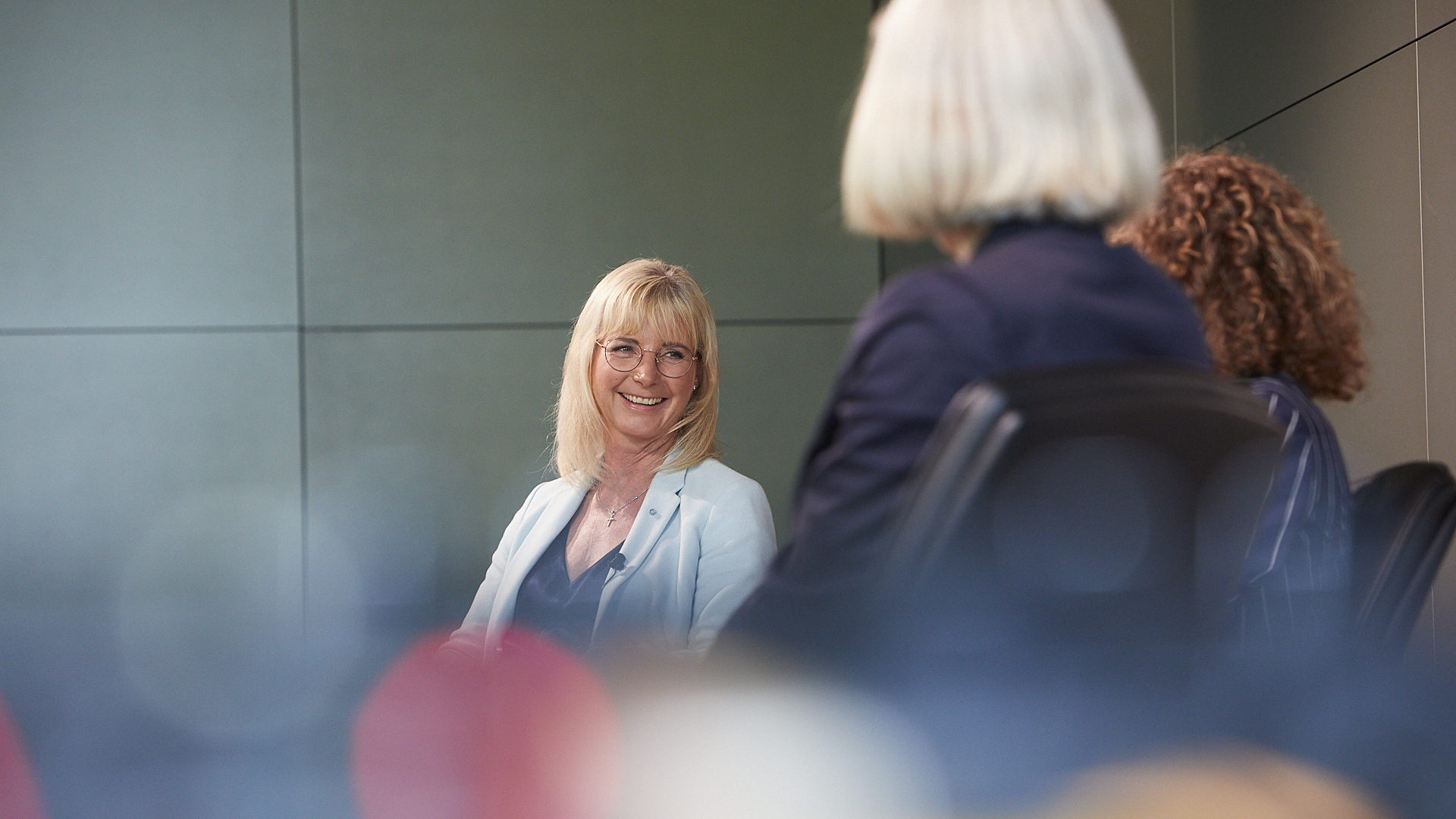 Auf dem Podium - Frau Staatsministerin Ulrike Scharf im Austausch mit Moderatorin Frau Sybille Giel und Frau Prof. Dr. Ursula Münch.