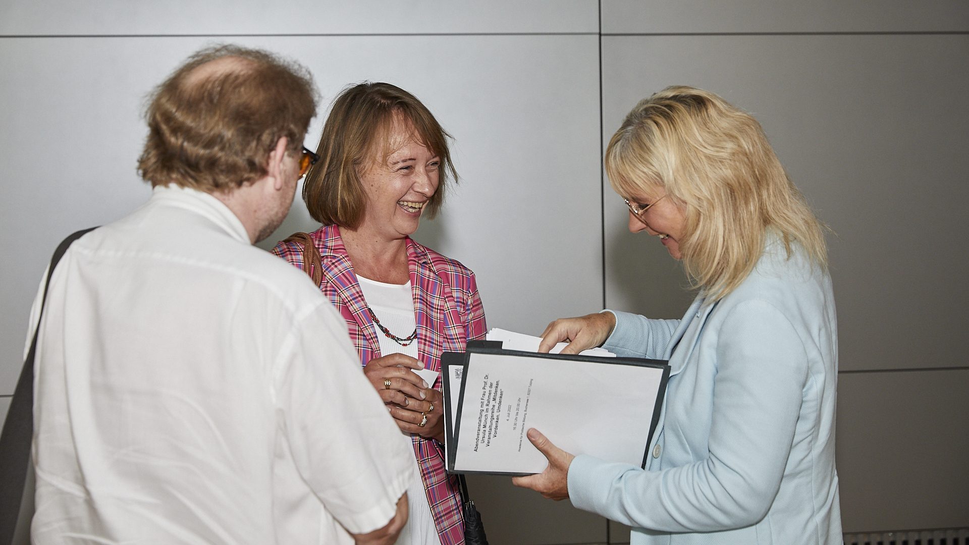 Frau Staatsministerin Ulrike Scharf, Frau Prof. Dr. Ursula Münch und Moderatorin Frau Sybille Giel auf dem Weg zur Veranstaltung.