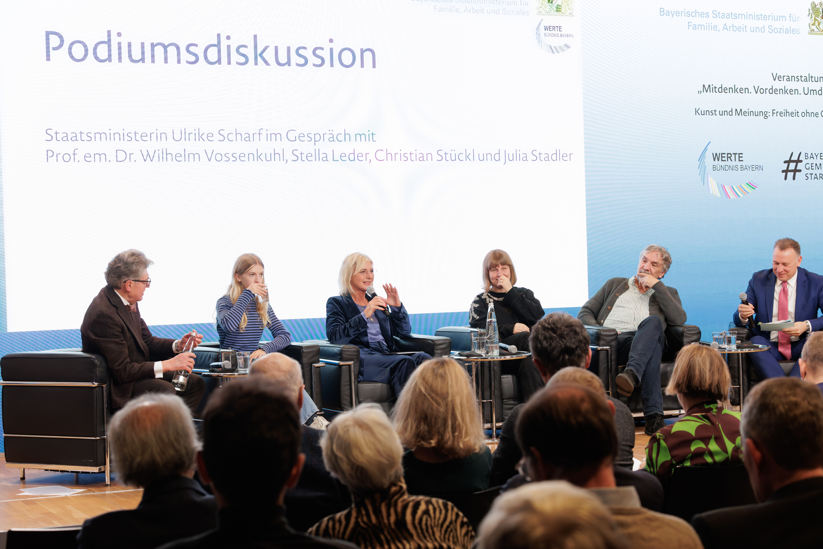 Zu diesen und weiteren Fragen sprach Staatsministerin Ulrike Scharf mit Prof. em. Dr. Wilhelm Vossenkuhl (Ludwig-Maximilians-Universität München), Christian Stückl (Intendant des Münchner Volkstheaters), Stella Leder (Geschäftsführerin des Instituts für Neue Soziale Plastik) sowie engagierten jungen Menschen aus dem Wertebündnis Bayern am 12. November 2024.